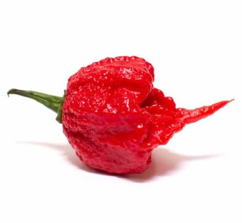 2. Carolina Reaper (2,200,000 SHU): Este pequeño monstruo, también obra de Currie, fue durante años el chile más picante del mundo. Su forma de «cola de escorpión» ya es una advertencia. Más allá de su brutalidad, es muy usado en salsas y en retos de comida para valientes (o insensatos).