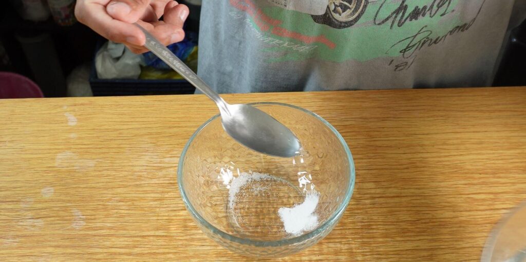 - Toma un poco de agua y viertela sobre el ácido y el benzoato para disolverlos juntos e incorporar.