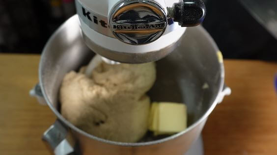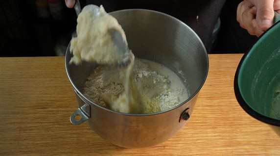 - En un bowl para batidora mezclar a velocidad media, harina, agua, huevo, azúcar, leche en polvo, sal y levadura junto con el tangzhong (pasta)